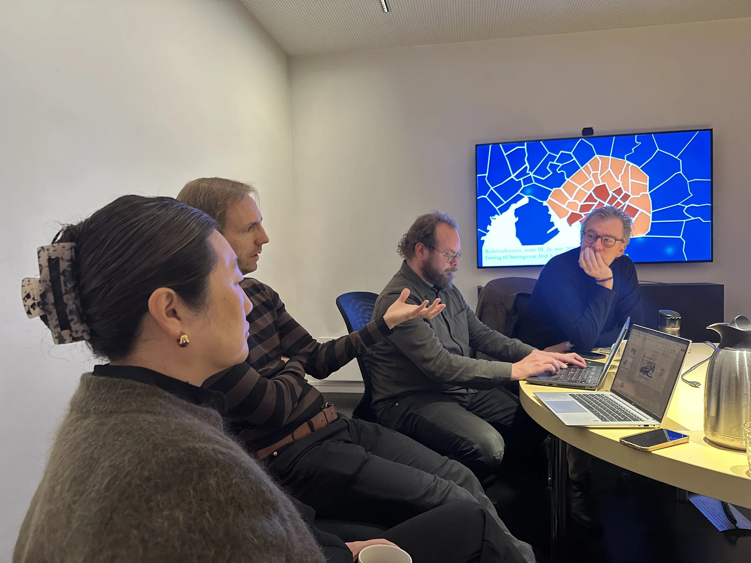 Camilla, Helge, Leo og Øystein. Kartet på veggen viser forslaget til hva området for en sentrumsbydel bør omfatte.