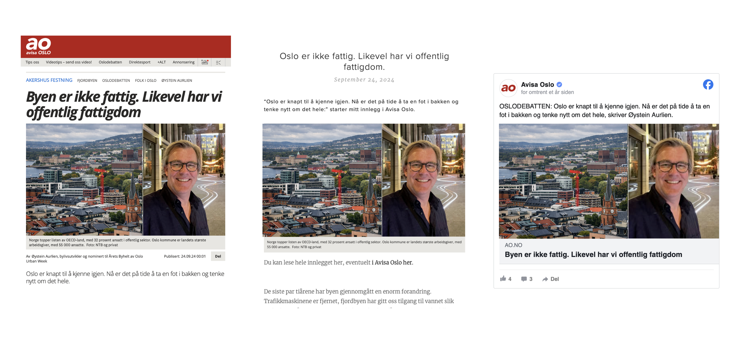 Til venstre er slik publiseringen først sto i Avisa Oslo. I midten er min publisering her, som Copyright Agent krevde meg 7.045 kroner for. Til høyre en lenkedeling NTB mener er tillatt. For ordens skyld er NTB-bildet her et AI-generert Oslobilde.